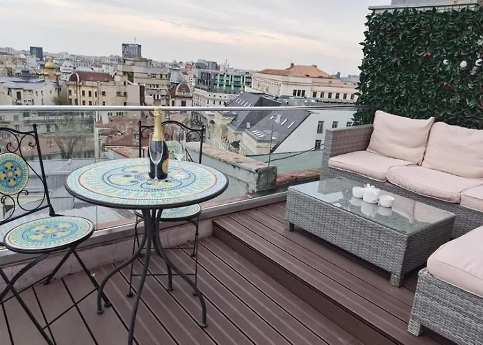 Das 35 m² große The View Studio Bukarest befindet sich im Viertel Stadtzentrum von Bukarest, ungefähr 5 Fußminuten von der Altstadt entfernt. Das 1-Zimmer-Apartment bietet einer Terrasse mit einem Ausblick auf die Stadt und liegt in nur 400 Meter Entfernung vom Caru' cu bere.